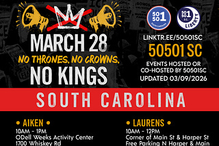 Action info and updates from the grassroots volunteer organizers of 50501 South Carolina.